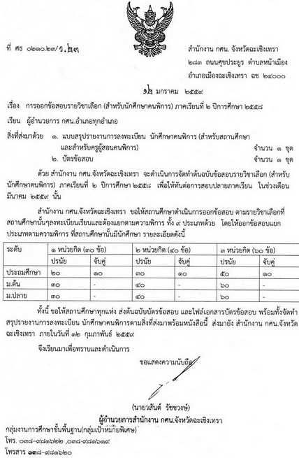| เรื่อง | การออกข้อสอบรายวิชาเลือก (สำหรับนักศึกษาคนพิการ) ภาคเรียนที่ ๒ ปีการศึกษา ๒๕๕๘ |