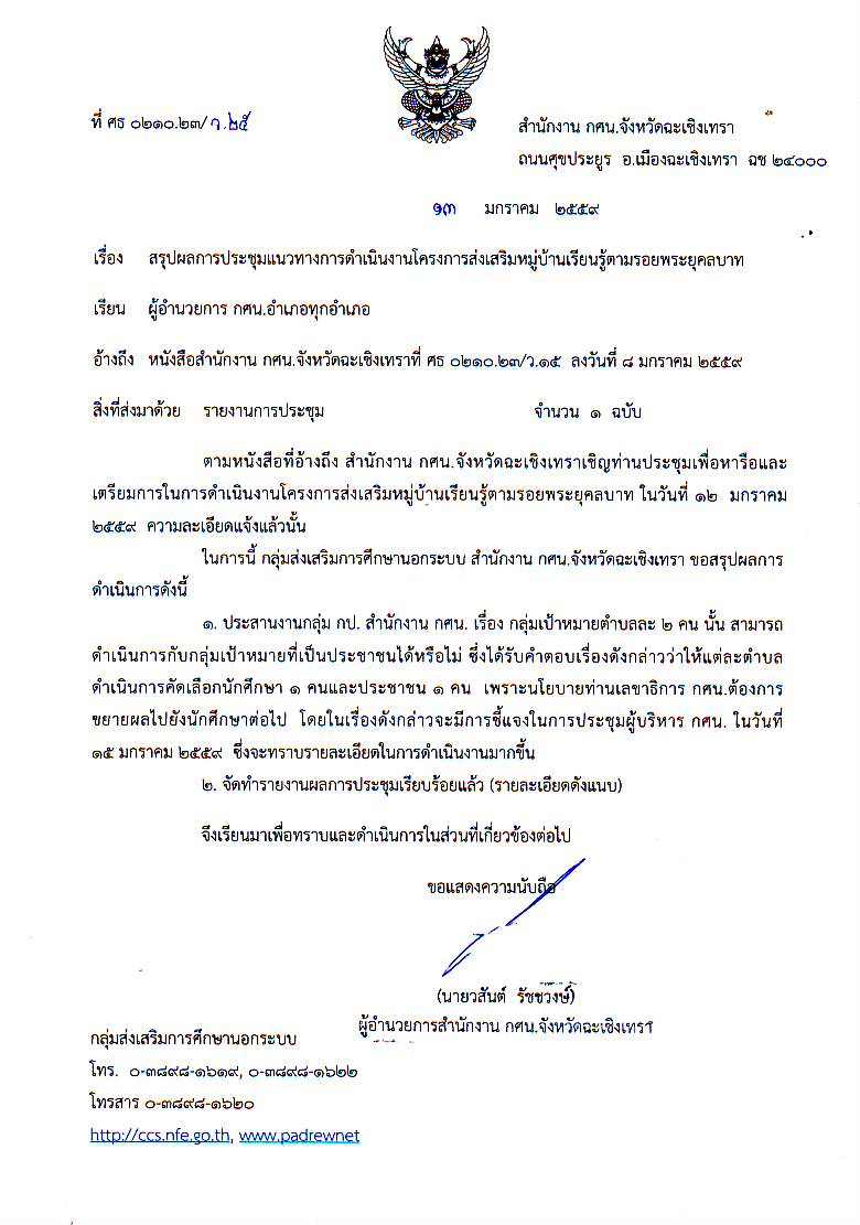 | เรื่อง | สรุปผลการประชุมแนวทางการดำเนินงานโครงการส่งเสริมหมู่บ้านเรียนรู้ตามรอยพระยุคคลบาท |