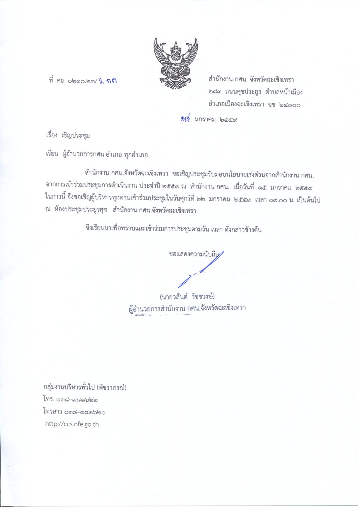 สำนักงาน กศน.จังหวัดฉะเชิงเทรา ขอเชิญประชุมรับนโยบายเร่งด่สนจากสำนักงาน กศน. จากการเข้าร่วมประชุมการดำเนินงาน ประจำปี 2559 ณ สำนักงาน กศน.เมื่อวันที่ 15 มกราคม 2559 จึงขอเชิญผู้บริหารทุกท่านเข้าร่วมประชุมในวันศุกร์ที่ 22 มกราคม 2559 เวลา 09.00 น. เป็นต้นไป ![]() ดาวน์โหลดไฟล์ที่1 |