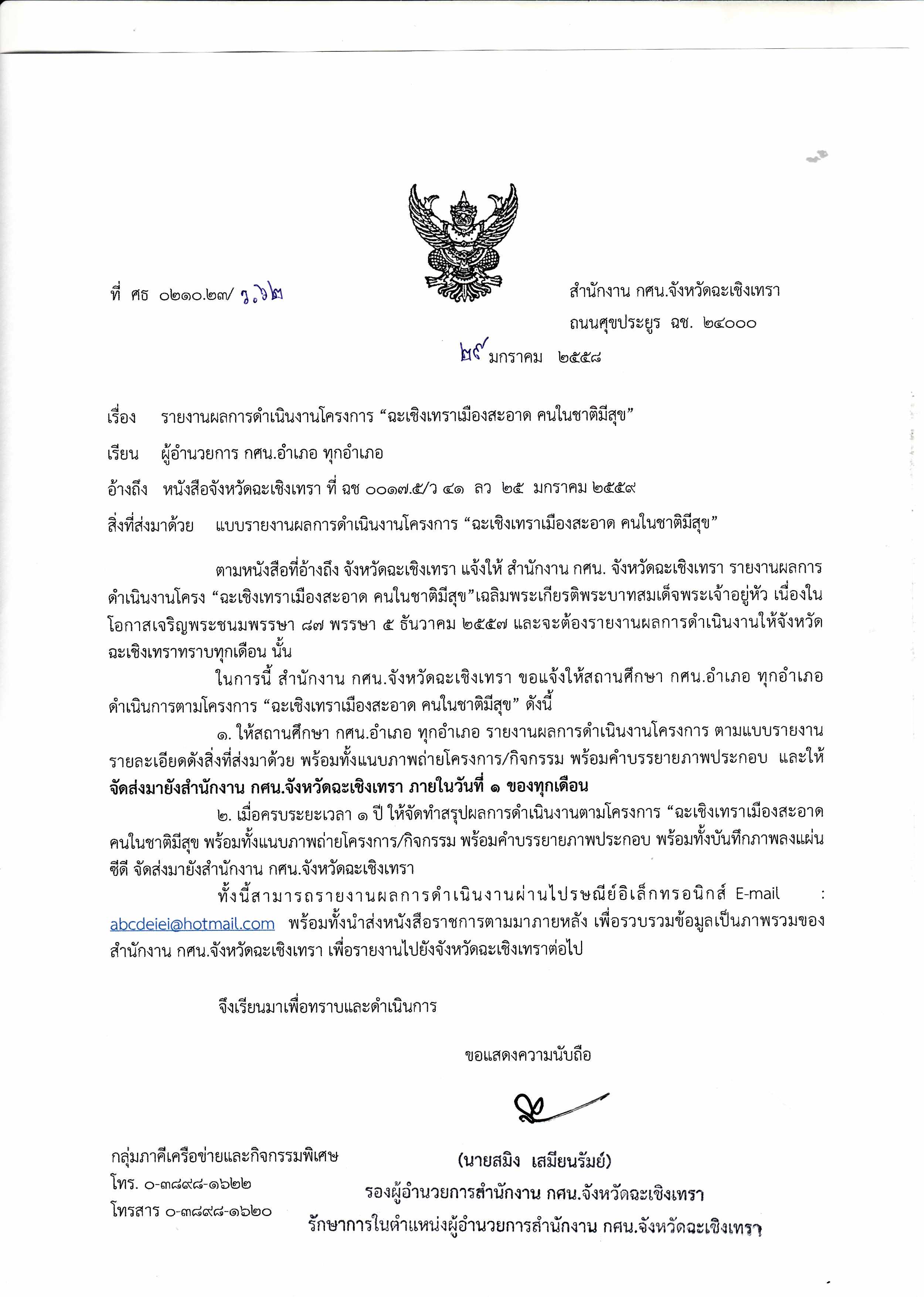 | เรื่อง | รายงานผลการดำเนินงานโครงการ ฉะเชิงเทราเมืองสะอาด คนในชาติมีสุข |
