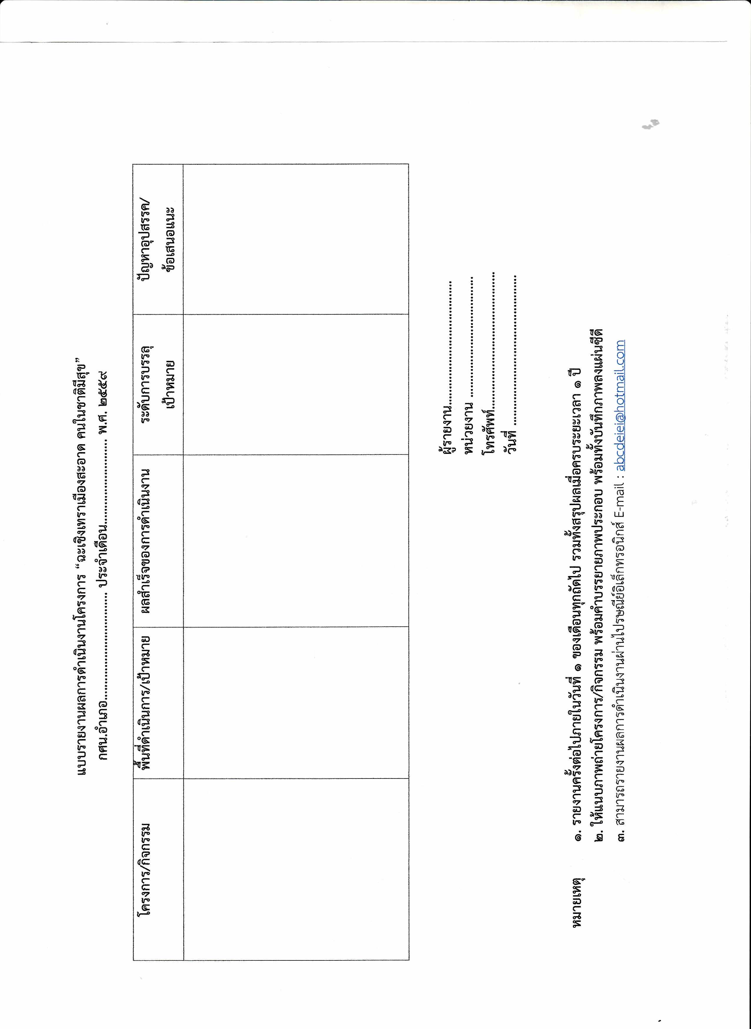เรียน ผู้อำนวยการ กศน.อำเภอทุกอำเภอ จังหวัดฉะเชิงเทรา แจ้งให้ สำนักงาน กศน. จังหวัดฉะเชิงเทรา รายงานผลการดำเนินงานโครง ฉะเชิงเทราเมืองสะอาด คนในชาติมีสุขเฉลิมพระเกียรติพระบาทสมเด็จพระเจ้าอยู่หัว เนื่องในโอกาสเจริญพระชนมพรรษา 87 พรรษา 5 ธันวาคม 2557 และจะต้องรายงานผลการดำเนินงานให้จังหวัดฉะเชิงเทราทราบทุกเดือน นั้น ในการนี้ สำนักงาน กศน.จังหวัดฉะเชิงเทรา ขอแจ้งให้สถานศึกษา กศน.อำเภอ ทุกอำเภอ ดำเนินการตามโครงการ ฉะเชิงเทราเมืองสะอาด คนในชาติมีสุข ดังนี้ 1. ให้สถานศึกษา กศน.อำเภอ ทุกอำเภอ รายงานผลการดำเนินงานโครงการ ตามแบบรายงาน รายละเอียดดังสิ่งที่ส่งมาด้วย พร้อมทั้งแนบภาพถ่ายโครงการ/กิจกรรม พร้อมคำบรรยายภาพประกอบ และให้จัดส่งมายังสำนักงาน กศน.จังหวัดฉะเชิงเทรา ภายในวันที่ 1 ของทุกเดือน 2. เมื่อครบระยะเวลา 1 ปี ให้จัดทำสรุปผลการดำเนินงานตามโครงการ ฉะเชิงเทราเมืองสะอาด คนในชาติมีสุข พร้อมทั้งแนบภาพถ่ายโครงการ/กิจกรรม พร้อมคำบรรยายภาพประกอบ พร้อมทั้งบันทึกภาพลงแผ่นซีดี จัดส่งมายังสำนักงาน กศน.จังหวัดฉะเชิงเทรา ทั้งนี้สามารถรายงานผลการดำเนินงานผ่านไปรษณีย์อิเล็กทรอนิกส์ E-mail : abcdeiei@hotmail.com พร้อมทั้งนำส่งหนังสือราชการตามมาภายหลัง เพื่อรวบรวมข้อมูลเป็นภาพรวมของสำนักงาน กศน.จังหวัดฉะเชิงเทรา เพื่อรายงานไปยังจังหวัดฉะเชิงเทราต่อไป ขอบคุณค่ะ/ทิวารัตน์ ![]() ดาวน์โหลดไฟล์ที่1 ดาวน์โหลดไฟล์ที่2 |