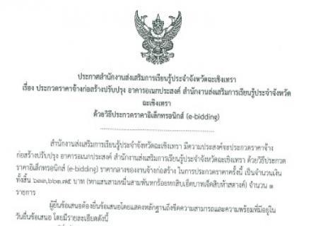 ประกาศสำนักงานส่งเสริมการเรียนรู้ประจำจังหวัดฉะเชิงเทรา เรื่อง ประกวดราคาจ้างก่อสร้างปรับปรุง อาคารอเนกประสงค์ สำนักงานส่งเสริมการเรียนรู้ประจำจังหวัดฉะเชิงเทรา ด้วยวิธีประกวดราคาอิเล็กทรอนิกส์ (e-bidding)