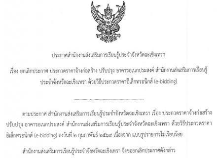 ยกเลิกประกาศ ประกวดราคาจ้างก่อสร้าง ปรับปรุง อาคารอเนกประสงค์ สำนักงานส่งเสริมการเรียนรู้ประจำจังหวัดฉะเชิงเทรา ด้วยวิธีประกาศราคาอิเบ็กทรอนิกส์ (e-bidding)