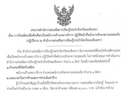 ประกาศสำนักงานส่งเสริมการเรียนรู้ประจำจังหวัดฉะเชิงเทรา เรื่อง การรับสมัครเพื่อคัดเลือกเป็นพนักงานจ้างเหมาบริการ ปฏิบัติหน้าที่พนักงานรักษาความปลอดภัย (ปฏิบัติงาน ณ สำนักงานส่งเสริมการเรียนรู้ประจำจังหวัดฉะเชิงเทรา)
