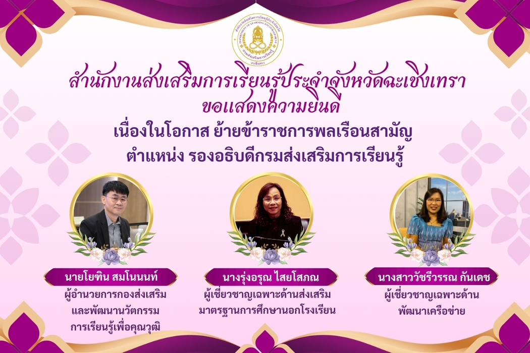 สำนักงานส่งเสริมการเรียนรู้ประจำจังหวัดฉะเชิงเทรา ขอแสดงความยินดีกับรองอธิบดีกรมส่งเสริมการเรียนรู้